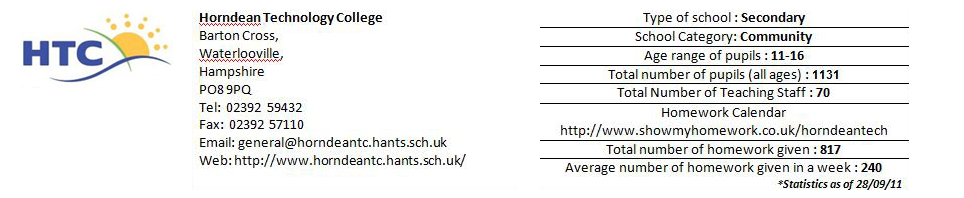 Horndean Technology College (HTC), a specialist Technology College, is a larger than average community secondary college. The College has been awarded the Investors in People Award and the International School Awards amongst other accolades. Homework policies existed whereby there was a rough weekly homework timetable and all homework was written by students in homework planners/diaries. In the past the College had invested much time and financial resources incorporating technology in the school so that students could view and complete assignments online, but this proved to be very cumbersome. HTC were looking for a working solution with a short roll out phase so that they could start using it for the next academic year.